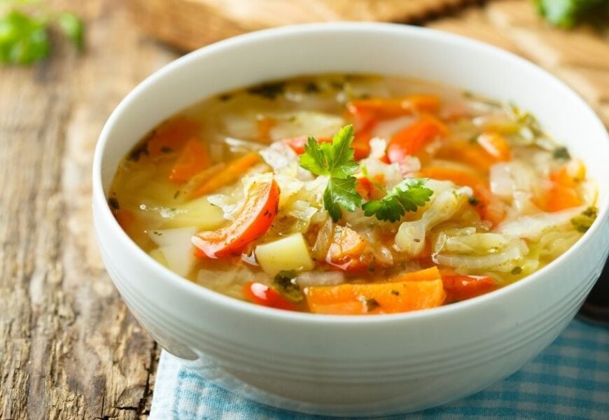Just look at all those veggies! This garden-fresh soup is absolutely chock full of them. You’ll find all sorts of great stuff in here like cabbage, carrots, spinach, and more.