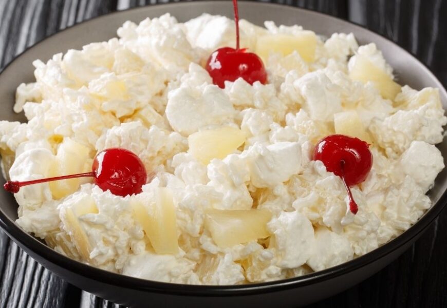 In just one bite, you’ll get a taste of pineapple, marshmallows, coconut, pecans, cherries, and a sweet, creamy dressing. It looks amazing and tastes even better. A++.